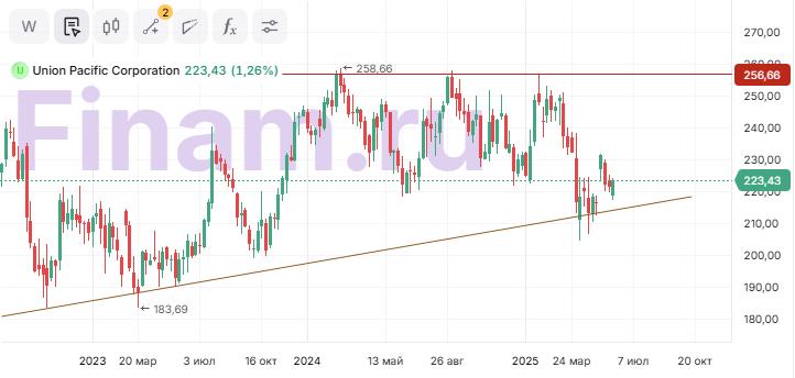 Union Pacific — крупнейший железнодорожный оператор на территории США. Компания стабильно платит дивиденды и проводит программу обратного выкупа акций, что дает потенциал роста цене. Выигрывает за счет роста спроса на логистику в контексте реиндустриализации США, а также масштабных инвестиций в инфраструктуру и стратегических партнерств.