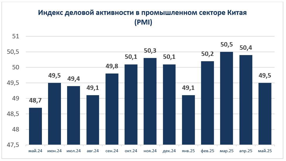 В мае 2025 года промышленный сектор Китая столкнулся с заметным замедлением. Официальный индекс деловой активности (PMI), рассчитываемый Государственным статистическим управлением (NBS), составил 49,5, оставаясь ниже порогового уровня 50, что свидетельствует о продолжающемся снижении активности. Более тревожный сигнал поступил от частного сектора: индекс Caixin/S&P Global PMI упал до 48,3 — минимального значения за почти три года. Это отражает ухудшение условий для малых и средних предприятий, которые страдают от снижения внешнего спроса и нестабильной внутренней конъюнктуры.