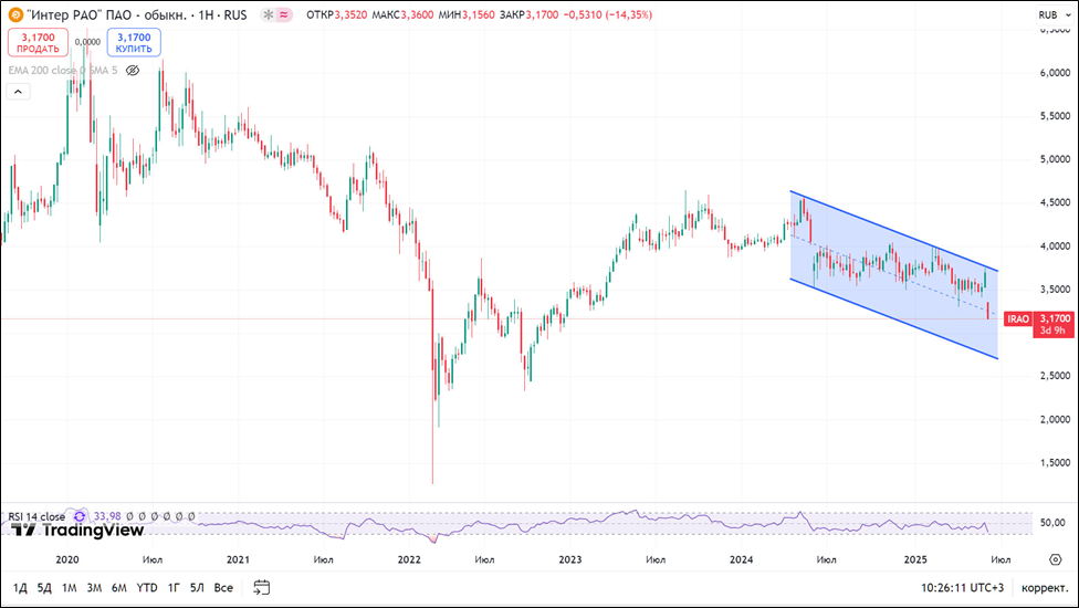 В акциях Интер РАО уже больше года наблюдается коррекция, в рамках которой снижение составляет около 30%, правда, это не считая дивидендов. В частности, только 9 июня был дивидендый гэп, который превысил 10%.
