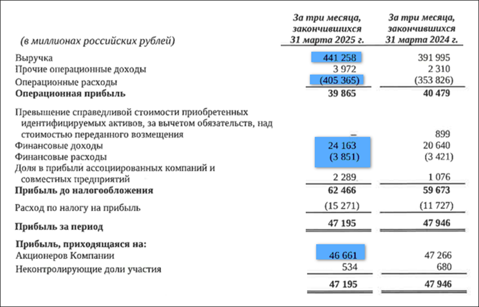 Благодаря росту РСВ, а также приобретению в 2024 году двух гарантирующих поставщиков «Екатеринбургэнергосбыт» и «Псковэнергосбыт», выручка +12,6% г/г. Но на 15%, т.е. опережающими темпами, выросли операционные расходы. Таким образом, операционная прибыль снизилась на 2%. Но благодаря высокой ключевой ставке увеличились доходы по депозитам. Финансовые доходы за вычетом расходов превысили 20 млрд. В итоге, прибыль до налогообложения +5%. Но весь эффект нивелировался увеличением расходов по налогу на прибыль. Из-за этого чистая прибыль (ЧП) снизилась на 1% год к году до 46,6 млрд.