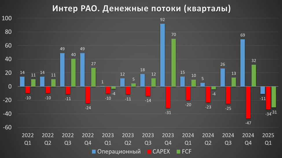 Операционная деятельность впервые отрицательная (из-за изменений в оборотном капитале), кап затраты высокие. В итоге, свободный денежный поток -31 млрд. Худшее значение за всё время.