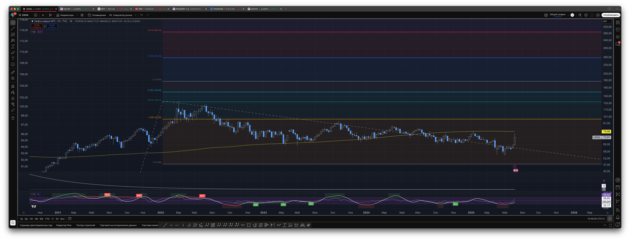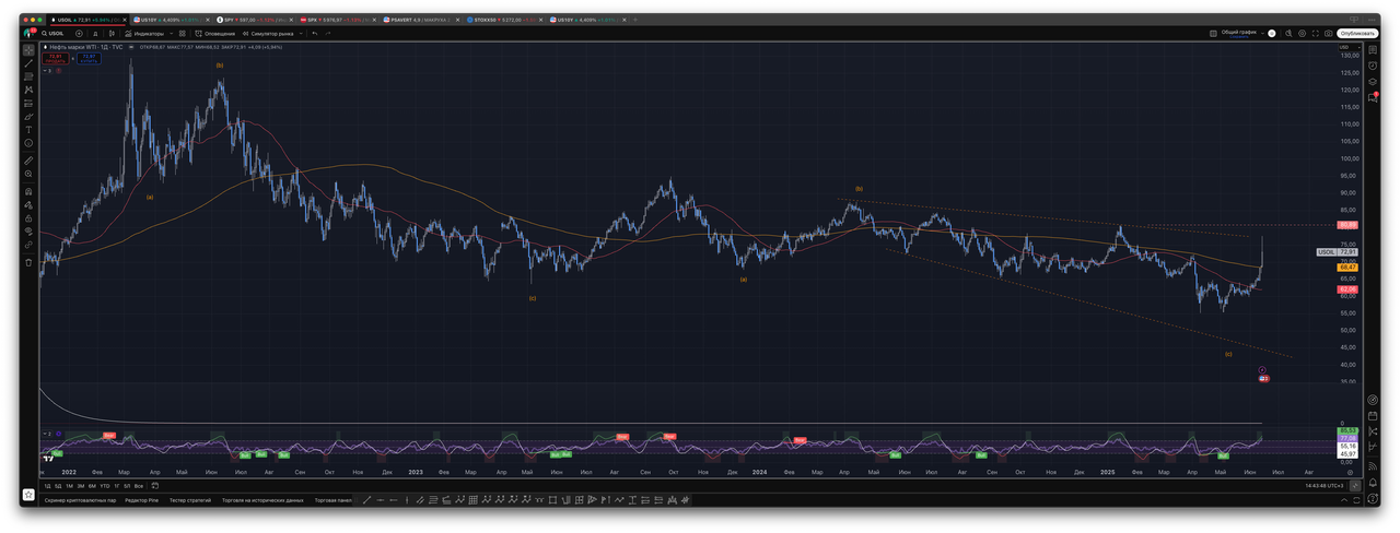 В качестве базового сценария я рассматриваю первый вариант - быстрое завершение эскалации или паузу в конфликте. При таком развитии событий нефть не преодолеет отметку в $81 за одну бочку и отправится вниз, после чего и последует мощнейший разворот, ведь этот сценарий предполагает именно временное прекращение боевых действий