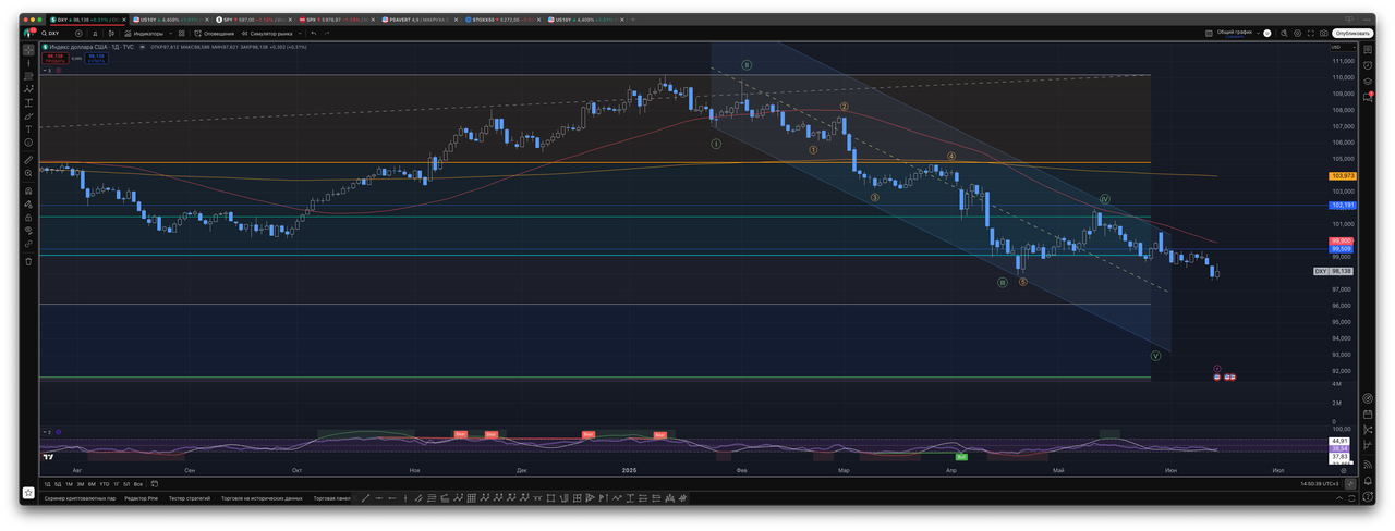 Индекс доллара DXY на новостях начал свое укрепление, однако уже на основной американской сессии продемонстрировал обратную динамику. На мой взгляд, глобально ситуация не изменилась за одним небольшим исключением.