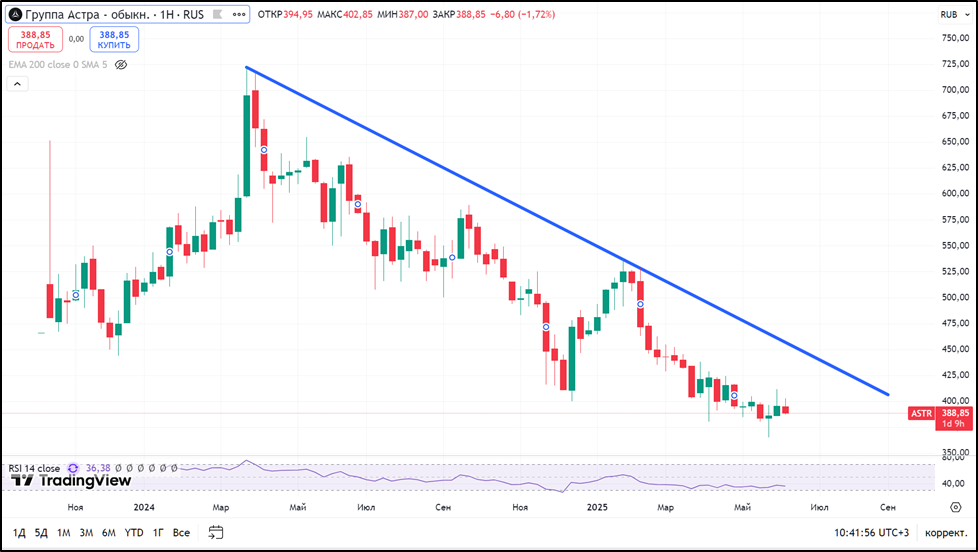 Нисходящий тренд длится более года. Падение с максимумов около 45%. А снижение с начала года составляет 17%. И на данный момент котировки ниже цен первого дня торгов после IPO. Но правда, само размещение проходило по цене 333₽.