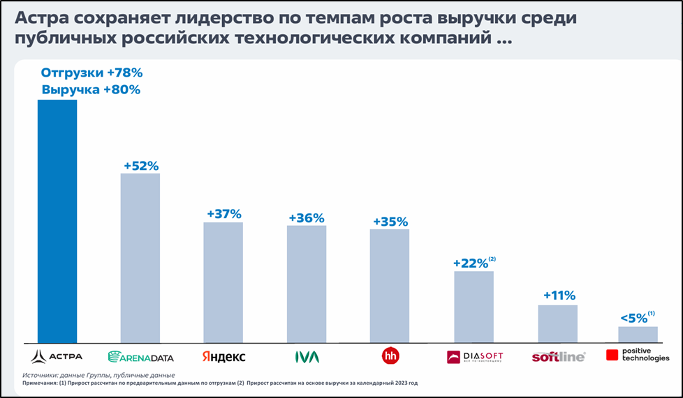 Астра сохраняет лидерство по темпам роста выручки среди публичных российских технологических компаний по итогам 2024 года.