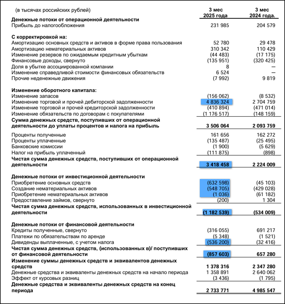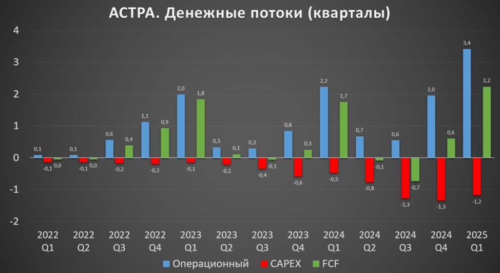Традиционно, в первых кварталах свободный денежный поток высокий, так получается за счет того, что на этот период приходятся основные выплаты покупателей. В 1Q 2025 FCF рекордный = +2,2 млрд.