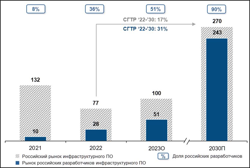 Перспективы: ожидается рост продаж российских разработчиков инфраструктурного ПО на 31% ежегодно. Астра планирует удвоить чистую прибыль за два года. Риски: возврат иностранных вендоров, конкуренция, падение темпов роста, доп эмиссии.