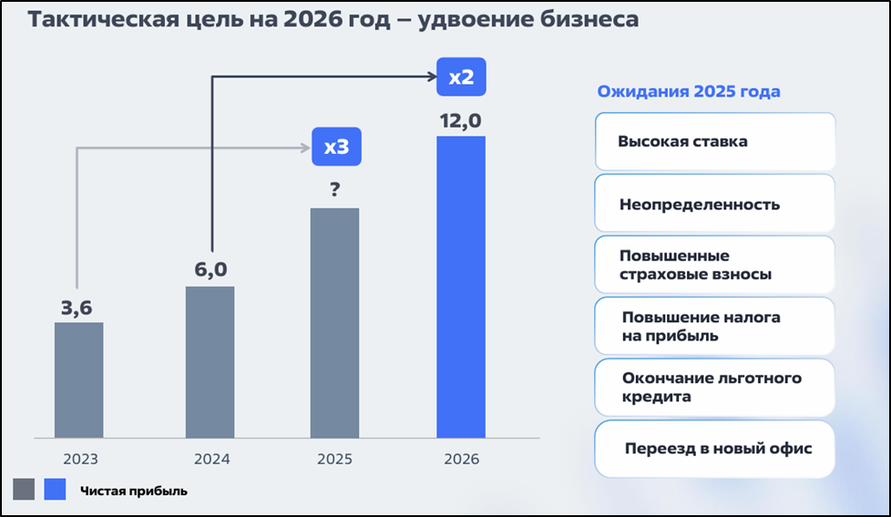 Похоже, что прошлую цель по утроению ЧП с 2023 по 2025г, выполнить не удастся. Новая тактическая цель - двухкратный рост чистой прибыли по итогам 2026 года относительно 2024 года. Для ее достижения, компания запустила новый раунд долгосрочной программы мотивации. Он будет проводится за счет 2,5 млн акций квазиказначейского пакета (без дополнительной эмиссии) и распространится на топ-менеджмент и ключевых сотрудников.