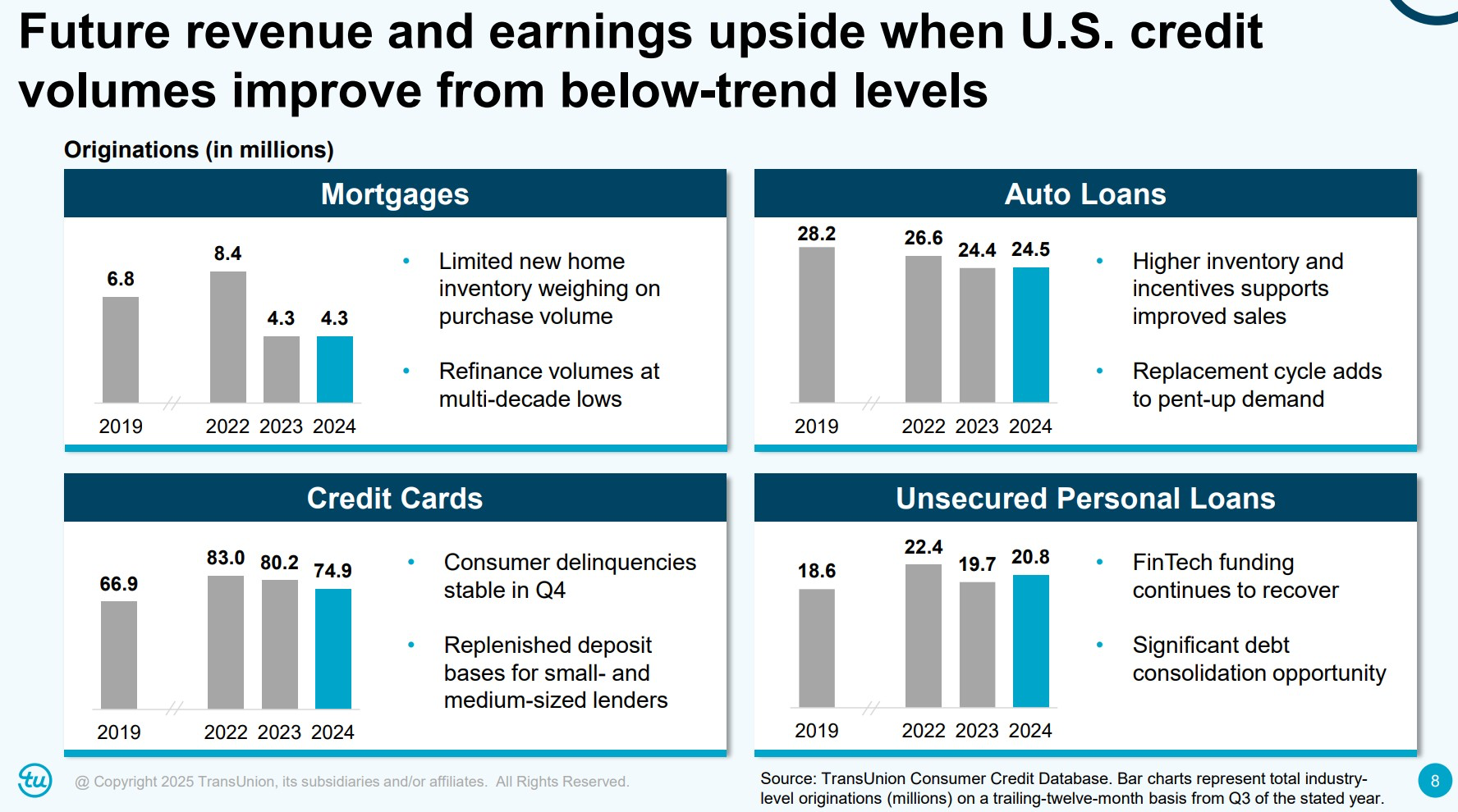 Ставки и инфляция остаются ключевыми факторами, определяющими спрос на кредиты, а значит — и на услуги по оценке кредитного риска. Международный сегмент TransUnion выигрывает от смягчения денежно-кредитной политики в ряде стран, включая Еврозону, Великобританию, Индию, а также от умеренного уровня ставок в Канаде.
