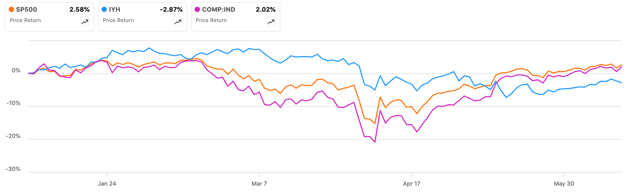 Динамика доходности Ishares U.S. Healthcare ETF, индексов S&P 500 и Nasdaq Composite YTD