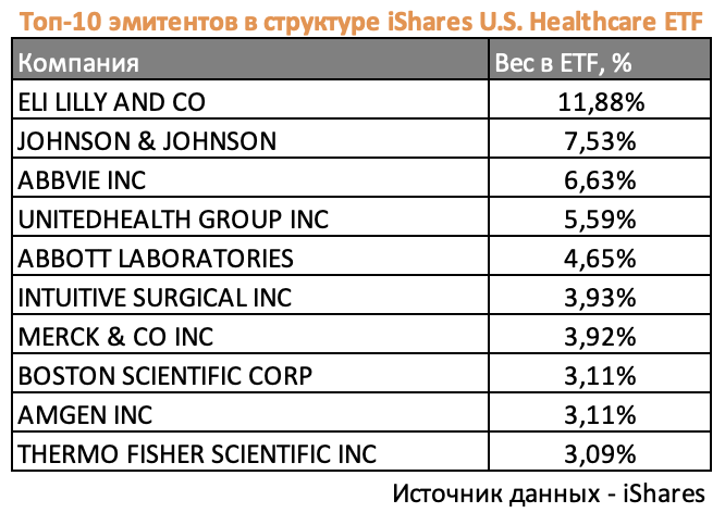 Наибольшие доли в рассматриваемом ETF имеют компании Eli Lilly, Johnson & Johnson, AbbVie и UnitedHealth суммарно занимающие 36% активов фонда.