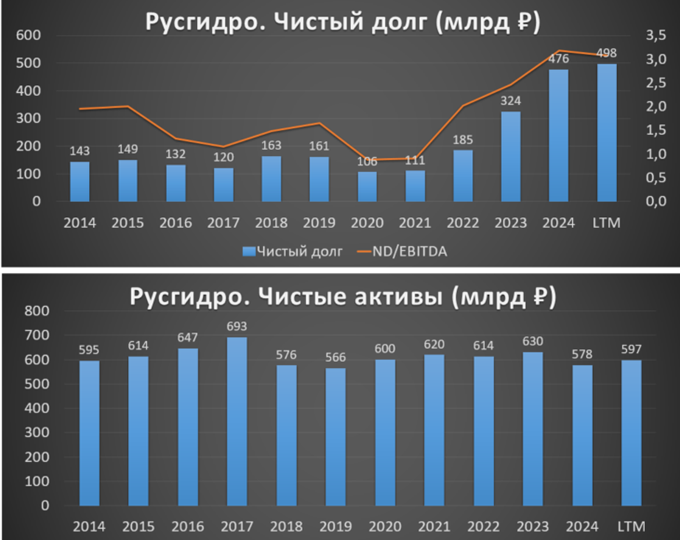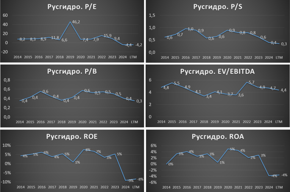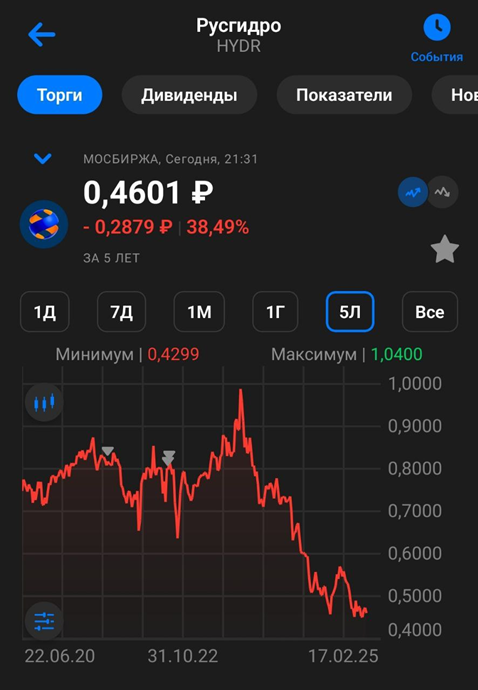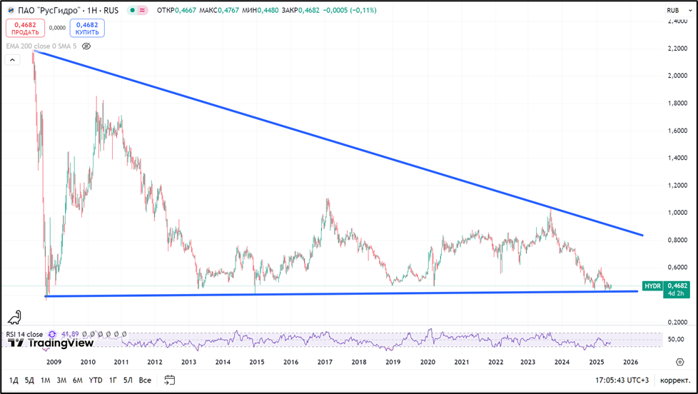 Акции РусГидро торгуются недалеко от своих исторических минимумов 2009 года. С начала 2025 года снижение около 10%.