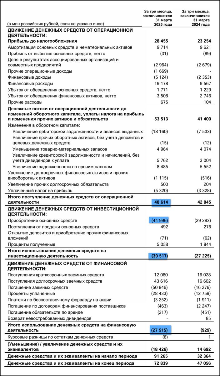 инвестиционный: -40 млрд (+45% г/г). На кап затраты ушло 45 млрд.