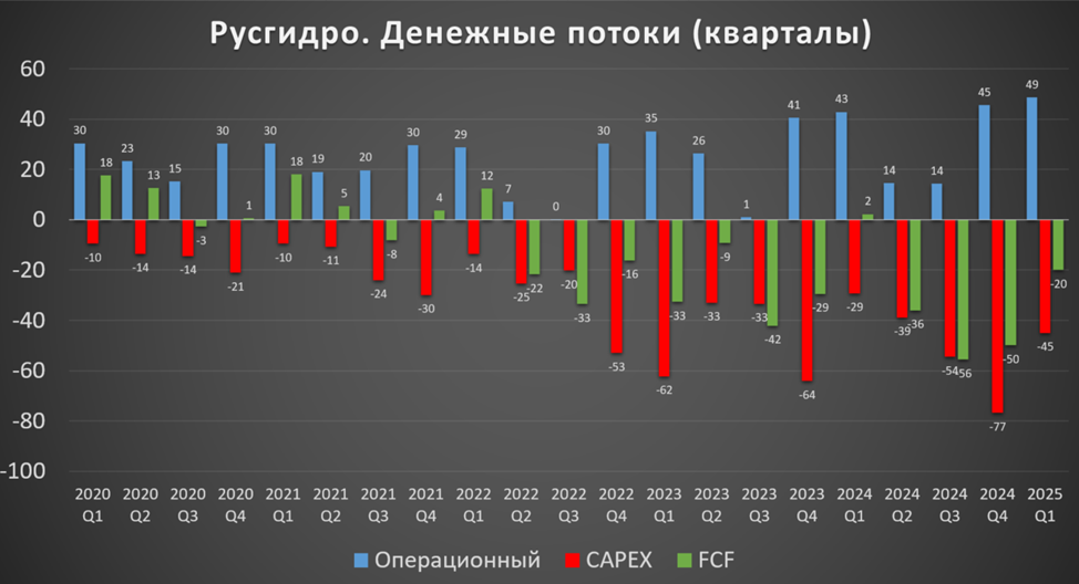 Операционный поток 1Q 25 рекордный. Но кап затраты также высокие, плюс у компании большие процентные расходы, таким образом, свободный денежный поток снова отрицательный – 20 млрд за квартал. Это отражает то, что компания не способна самостоятельно финансировать возросшие капитальные затраты, из-за этого растет долг.