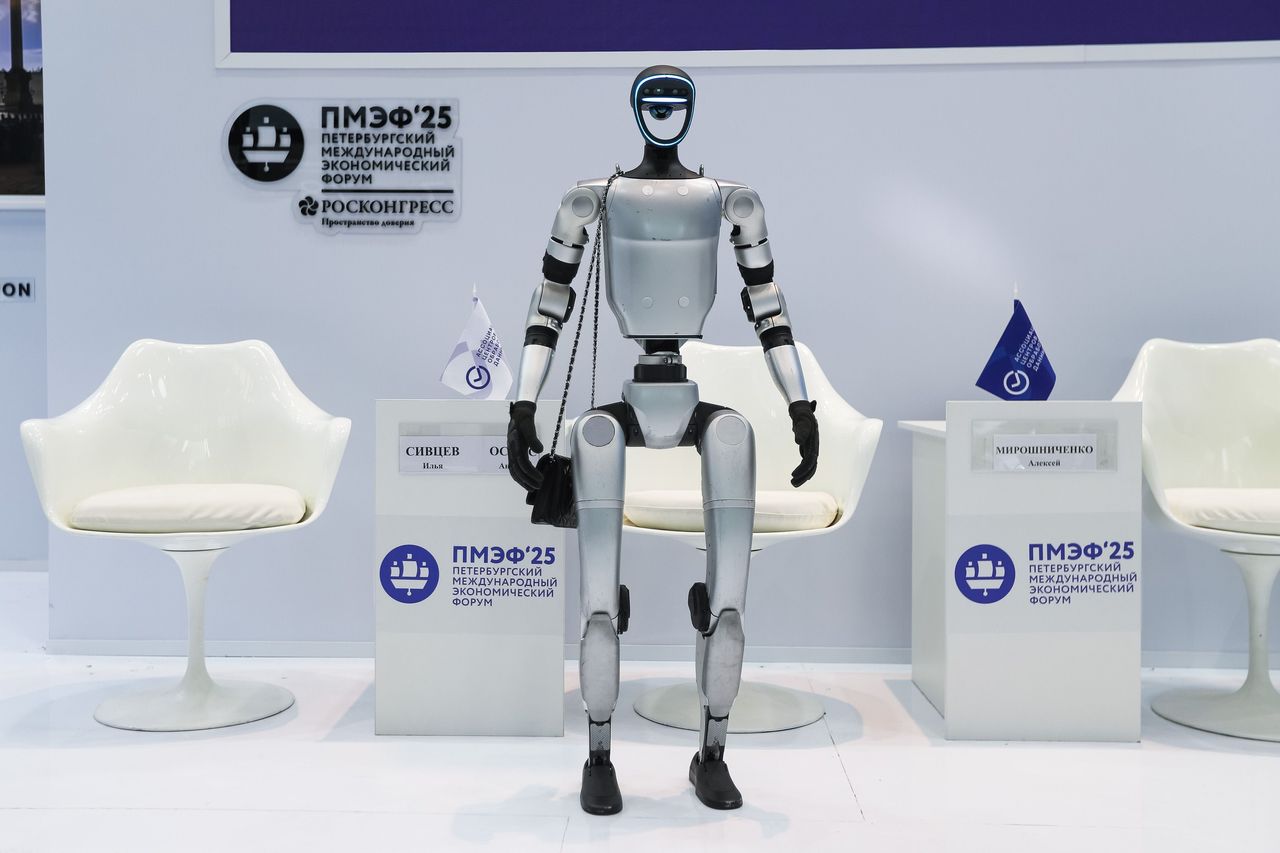 Гостей форума в этом году развлекал робот Володя. Он разгуливал по площадке форума с сумочкой Dior и здоровался с посетителями.