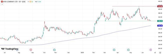 С технической точки зрения на графике акции BYD торгуются выше 200-дневной скользящей средней, сигнализируя о продолжении долгосрочного бычьего тренда.