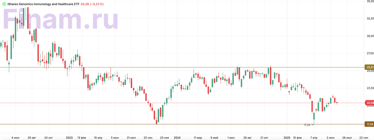 Рассматриваемый ETF за период с начала года находится в минусе на 10%, показав динамику слабее рынка. Для сравнения: индекс S&P 500 окреп на 2%, индекс высокотехнологичных отраслей NASDAQ Composite также подрос почти на 2%. В целом весь 2024 г. iShares Genomics Immunology and Healthcare ETF пребывал в боковике, но с апреля этого года бумага перешла в фазу отскока и имеет хорошие шансы продолжить его в перспективе ближайшего года.