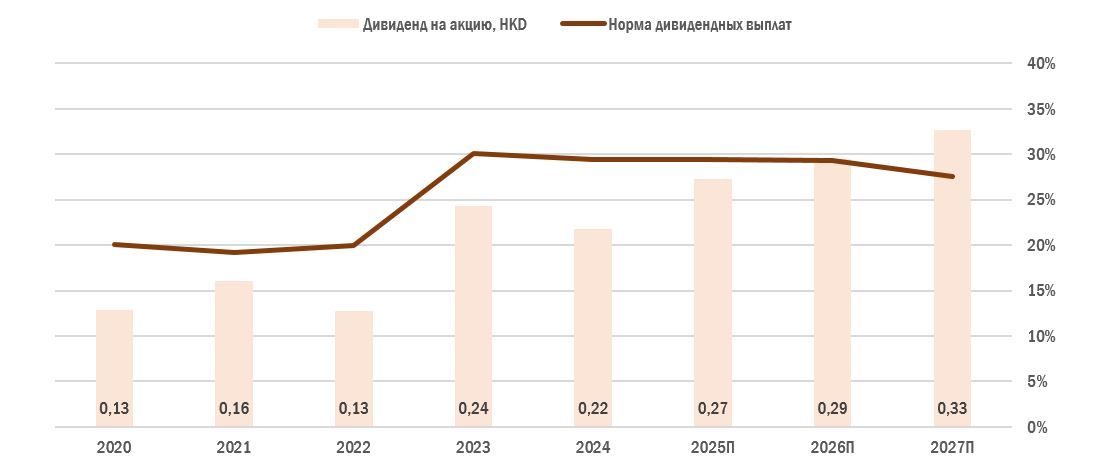 Регулярные дивиденды. В последние 2 года China Longyuan Power увеличила коэффициент выплат дивидендов до 29–30% от чистой прибыли, что, безусловно, стало позитивным событием для акционеров. Мы ожидаем, что в ближайшие 12 месяцев компания выплатит HKD 0,27 на акцию, что соответствует неплохой дивидендной доходности на уровне 3,9%.