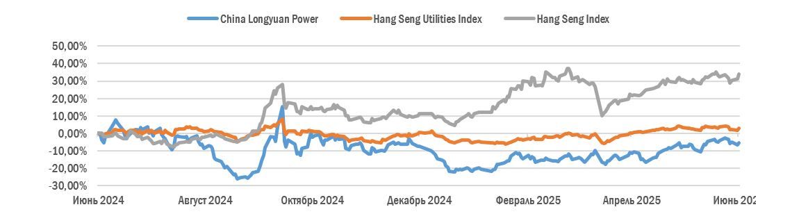 Акции Longyuan Power продолжают отставать от широкого гонконгского рынка и отраслевого индекса. За последние 12 месяцев бумаги компании подешевели на 5,6%, в то время как индекс Hang Seng вырос на 34,1%, а индекс коммунального сектора Hang Seng Utilities прибавил 2,9%. Отставание котировок Longyuan Power стало заметным с октября 2024 года — на фоне стабилизации Hang Seng после объявления китайским правительством мер поддержки экономики. С начала 2025 года давление на акции усилилось: бумаги Longyuan остались в стороне от рыночного ралли, вызванного стремительным ростом китайских технологических компаний на волне прогресса в сфере искусственного интеллекта.