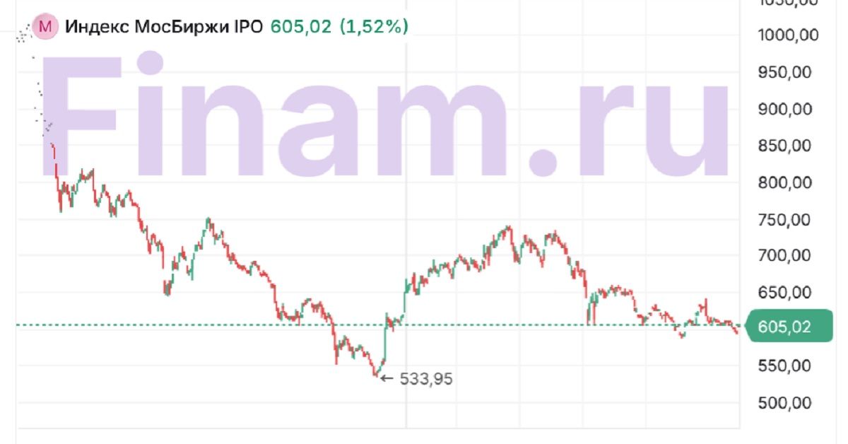 Между тем, более широкая картина смотрится хуже. Мосбиржа в апреле 2024 года начала рассчитывать индекс IPO, который должен «демонстрировать ценовые уровни компаний, недавно начавших свою публичную историю». Состав индекса пересматривается ежеквартально, торги начались с уровня 1000 пунктов, а сегодня его значение составляет около 605 (минус 39,5% с момента начала его расчета).
