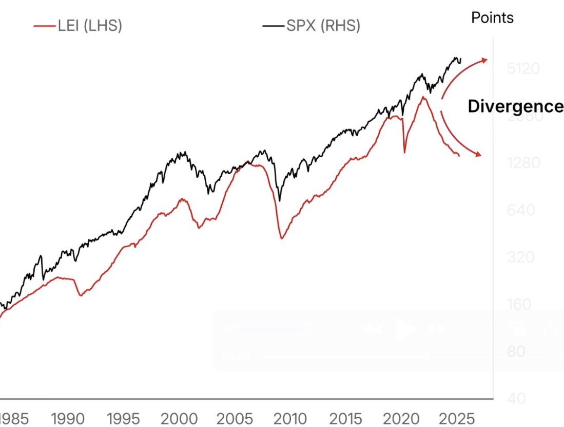 Ведущие экономические индикаторы резко упали , но фондовый рынок всё ещё находится вблизи рекордных максимумов. Сегодня мы наблюдаем значительное расхождение между виртуальной и реальной экономикой.