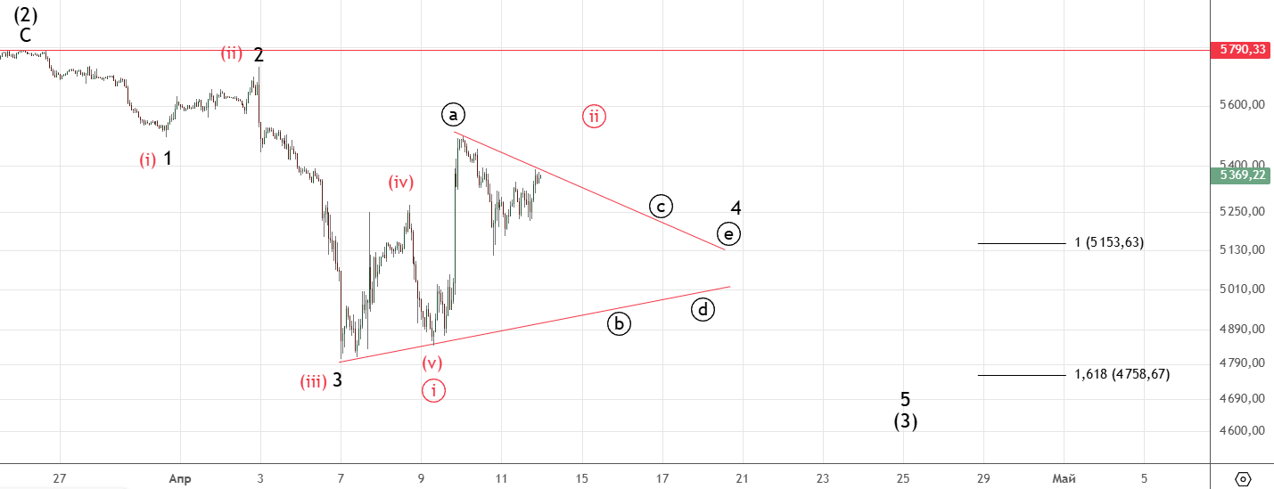 Быстрый отскок вверх выглядит неожиданным , но страшного тут пока ничего нет. На графике показаны два варианта , красным более медвежий — серия 1-2 вниз . Черным — треугольник в волне 4 . Стоп — 5790.33