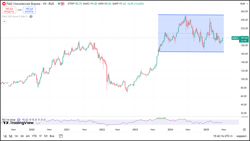 Последние почти два года, акции Мосбиржи торгуются в боковике. Снижение с максимумов чуть более 20%. А с начала года динамика околонулевая.