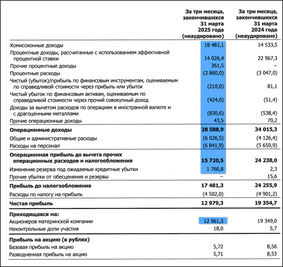 Комиссионные доходы потихоньку растут. Но процентные доходы рухнули в 2,5 раза за два квартала. Текущее значение самое низкое с 2022 года. При этом операционные расходы остаются высокими. Основные причины: рост расходов на персонал (из-за увеличения штата); а также рост расходов на рекламу и маркетинг за счет проекта «Финуслуги».