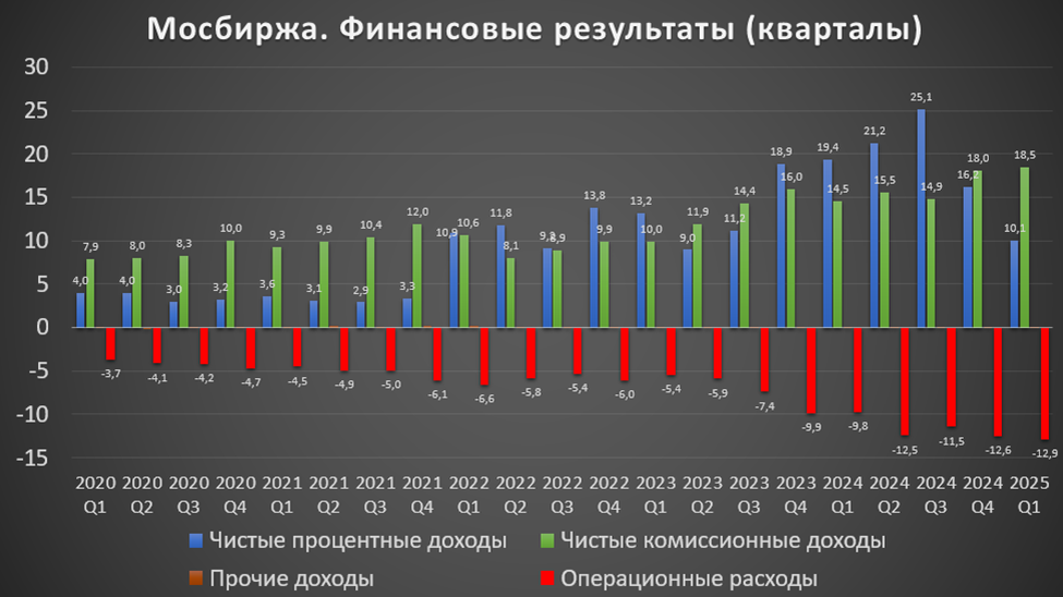 Суммарный объем торгов стабилизировался. Финансовые результаты 1Q 2025 негативные. На фоне падения ЧПД, на треть рухнула ЧП. У Мосбиржи отрицательный чистый долг.