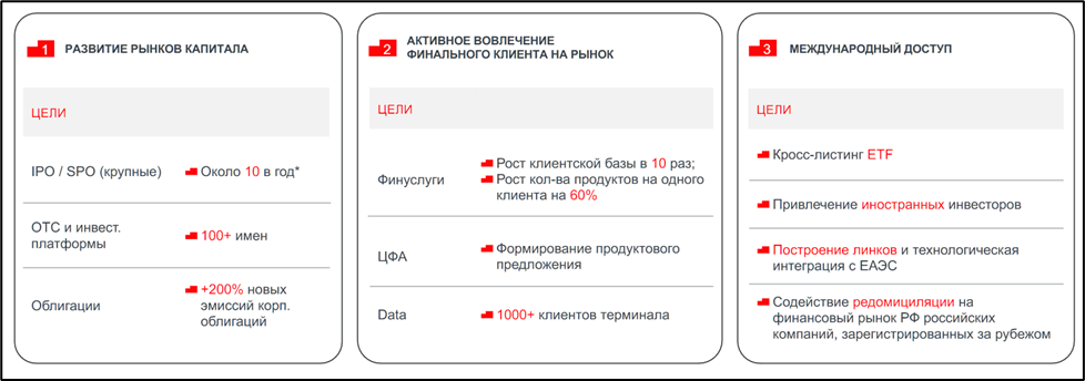 развивать рынки, проводя новые IPO/SPO, добавляя инструменты на внебиржевой рынок, размещая новые облигации.