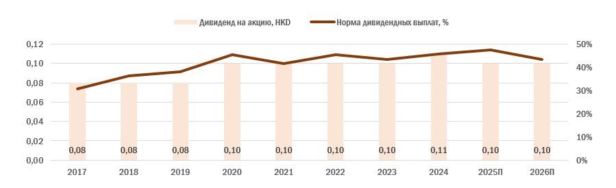 Стабильные дивиденды. Одной из целей на 2025–2030 гг. менеджмент ставит постепенный рост коэффициента дивидендных выплат, который в последние 5 лет в среднем составлял 43,7% от чистой прибыли. Мы ожидаем, что размер выплат за 2025 год составит HKD 0,1, это предполагает среднюю для гонконгского рынка дивидендную доходность 3,6%.