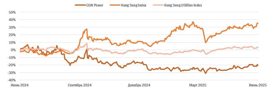 За последние 12 месяцев акции CGN Power снизились в цене на 20%, тогда как индекс Hang Seng вырос на 35%, а отраслевой индекс Hang Seng Utilities прибавил 3%. Такая слабая динамика частично объясняется коррекцией после, на наш взгляд, чрезмерного роста котировок в первой половине 2024 года. С начала текущего года акции стабилизировались вблизи предполагаемой справедливой оценки и пока не демонстрируют существенного роста.