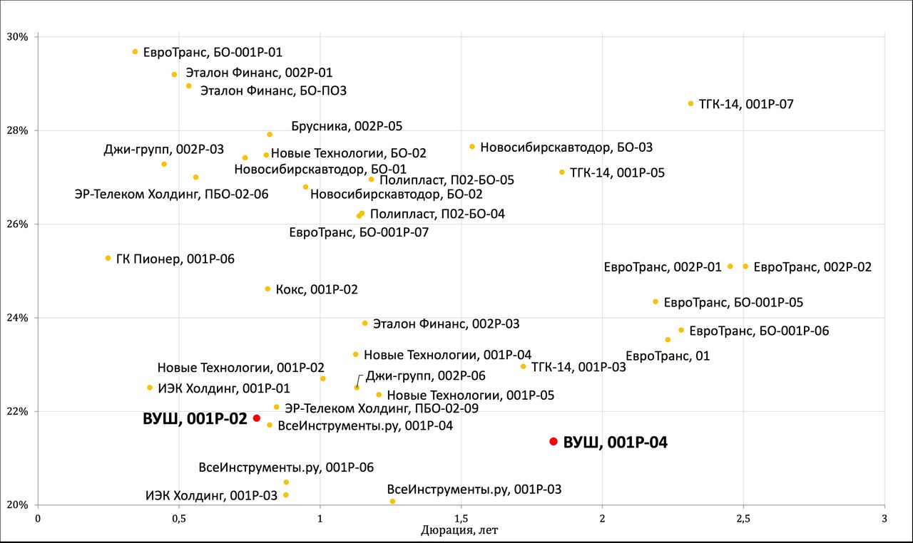 В сравнении с другими ликвидными выпусками с рейтингом A- облигации ВУШ демонстрируют относительно низкие уровни доходности, что связано с более высоким уровнем рисков у других эмитентов и повышенным недоверием инвесторов к ним по сравнению с репутацией кикшеринговой компании.