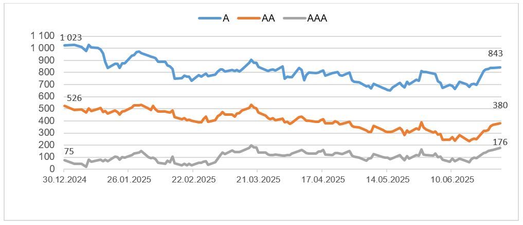 Важным моментом является размер кредитных премий у корпоративных облигаций. Дело в том, что он сейчас расширен относительно своих среднеисторических уровней, что потенциально позволяет рассчитывать на ценовой рост корпоративных облигаций во 2П25, даже при условии сохранения доходностей ОФЗ около текущих уровней. Конечно, резкий рост доходностей гособлигаций в моменте отыгрывается и в корпоративном сегменте, однако в целом, как показывает практика, расширенный размер премий способен амортизировать всплески волатильности базового актива (ОФЗ) на инвестиционном горизонте.