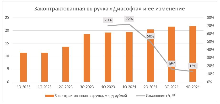 У «Диасофта» контракты расписаны на годы вперед. На 31 марта законтрактованная выручка составляла 21,7 млрд руб. (+13% г/г), но темпы роста показателя замедляются.