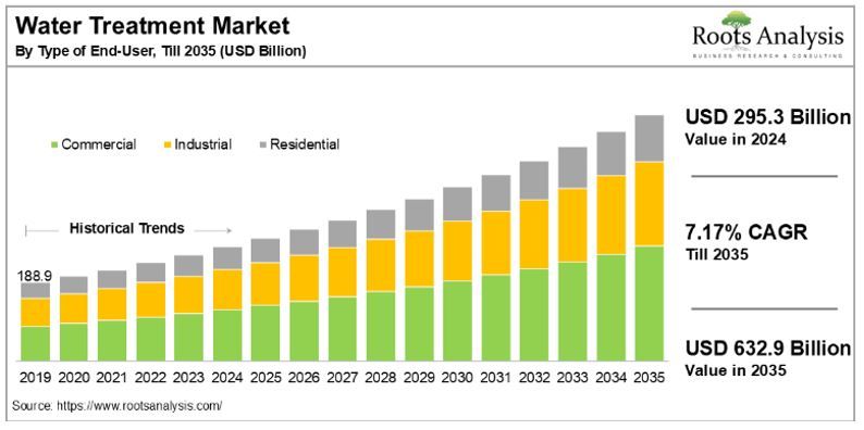Мировой рынок водоочистки быстро растет: его объем уже в 2024 г. достиг $295,3 млрд, а к 2035 г. прогнозируется удвоение до $632,9 млрд при среднегодовом темпе прироста 7,17%. Основными драйверами выступают нехватка пресной воды, ужесточение экологических требований, урбанизация и индустриализация, а также повышение спроса на устойчивые и цифровые технологии очистки. Главным заказчиком остаются коммерческие структуры, на долю которых приходится свыше 60% рынка. Основные игроки — Xylem, Ecolab, Pentair и др. В настоящий момент лидирующие позиции на мировом рынке водоочистки занимает Северная Америка, что отражается как в объеме инвестиций, так и в масштабе внедрения современных технологий. Однако наиболее высокие темпы прироста рынка фиксируются в Азиатском регионе, чему способствуют ускоренная урбанизация, индустриализация и активная реализация государственных программ по развитию водной инфраструктуры.