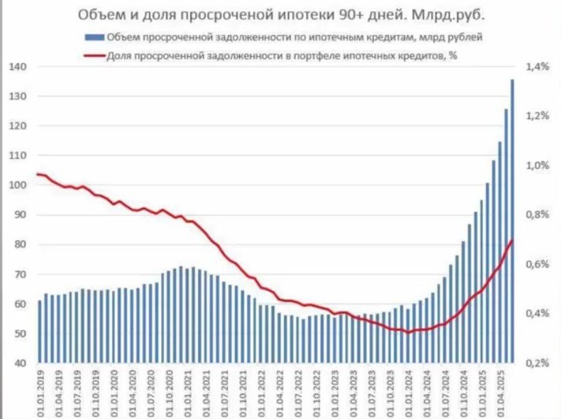 📉Рост начался весной 2024 года. За это время объём просрочки вырос в два раза. И тут пока нет большого резонанса только из-за доли. Сейчас эта доля чуть больше 1%. Что пока не критично. Но если график продолжит своё движение с такой же скоростью, то очень скоро эта доля станет опасной для банковской системы.