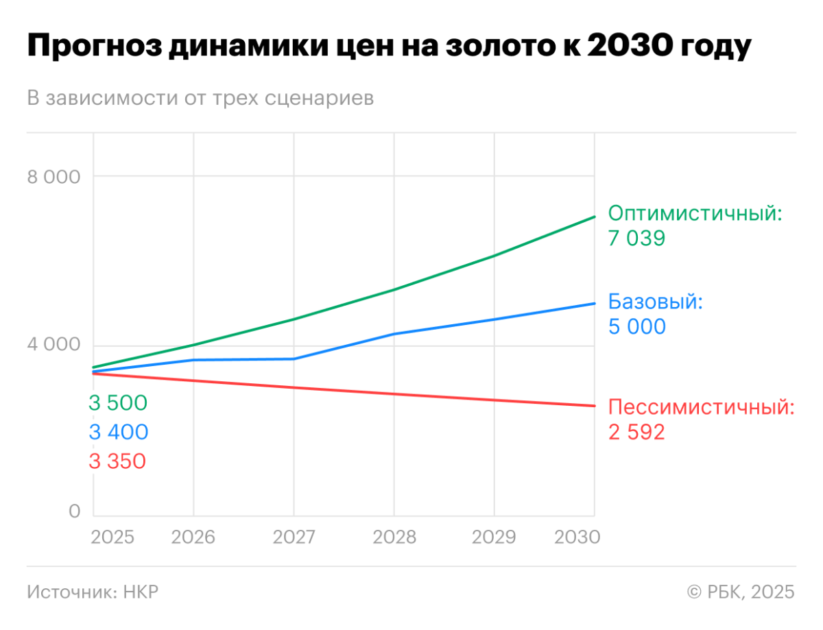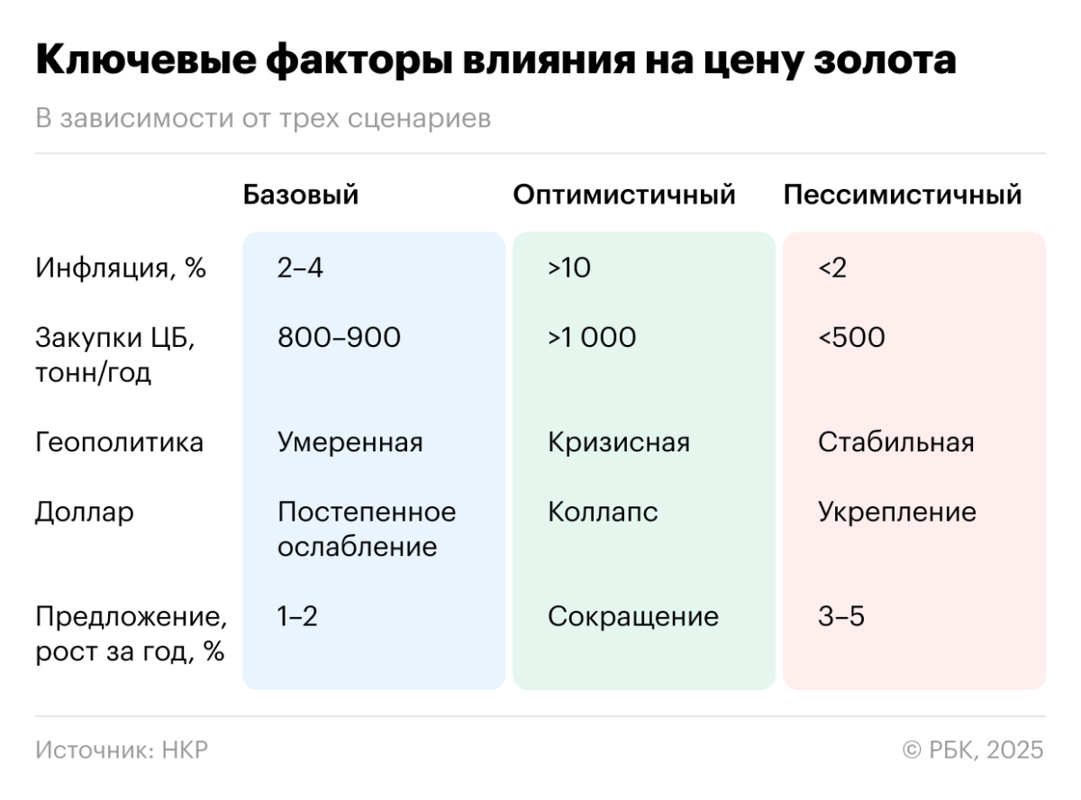 На основе анализа макроэкономических тенденций, соотношения спроса и предложения золота и геополитических рисков НКР выделяет три ключевых сценария.