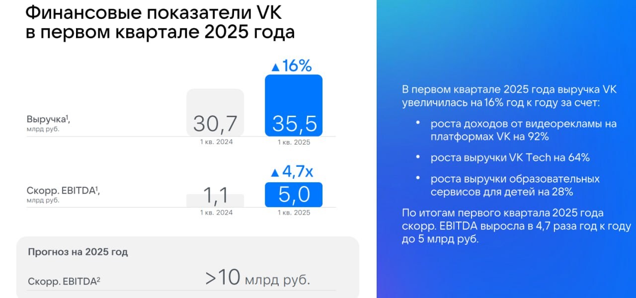 📈 Что касается результатов первого квартала, то здесь есть моменты, на которые стоит обратить внимание: выручка показала рост на 16% г/г - до 35,5 млрд руб. за счёт выручки от онлайн-рекламы, доходов от видеорекламы на платформах VK, а также выручки от VK Tech. При этом показатель скорректированной EBITDA увеличился в 4,7 раза г/г и составил 5 млрд руб, что обусловлено снижением операционных расходов, благодаря чему все операционные сегменты продемонстрировали положительную динамику.