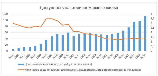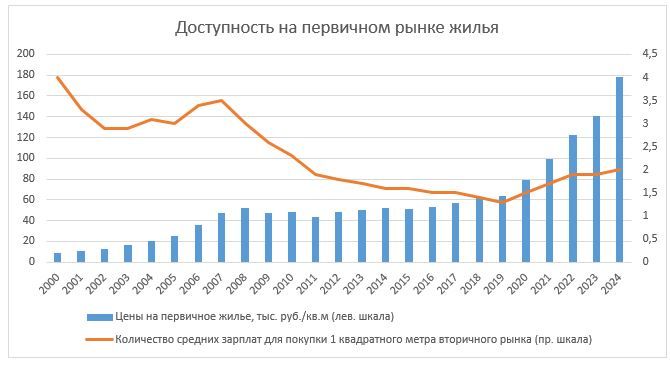 На первичном рынке жилье стало менее доступно (показатель вырос с 1,3 в 2019 году до 2 в 2024 году), но не критично, так как в начале нулевых доступность жилья была еще меньше.