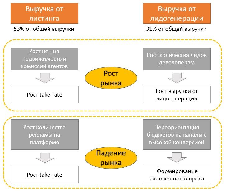 Бизнес-модель компании «Циан» обладает сетевым эффектом, который позволяет наращивать выручку при любой ситуации на рынке недвижимости. Два главных сегмента выручки — выручка от листинга и лидогенерации — приносят выгоду и при росте, и при снижении спроса на рынке недвижимости: