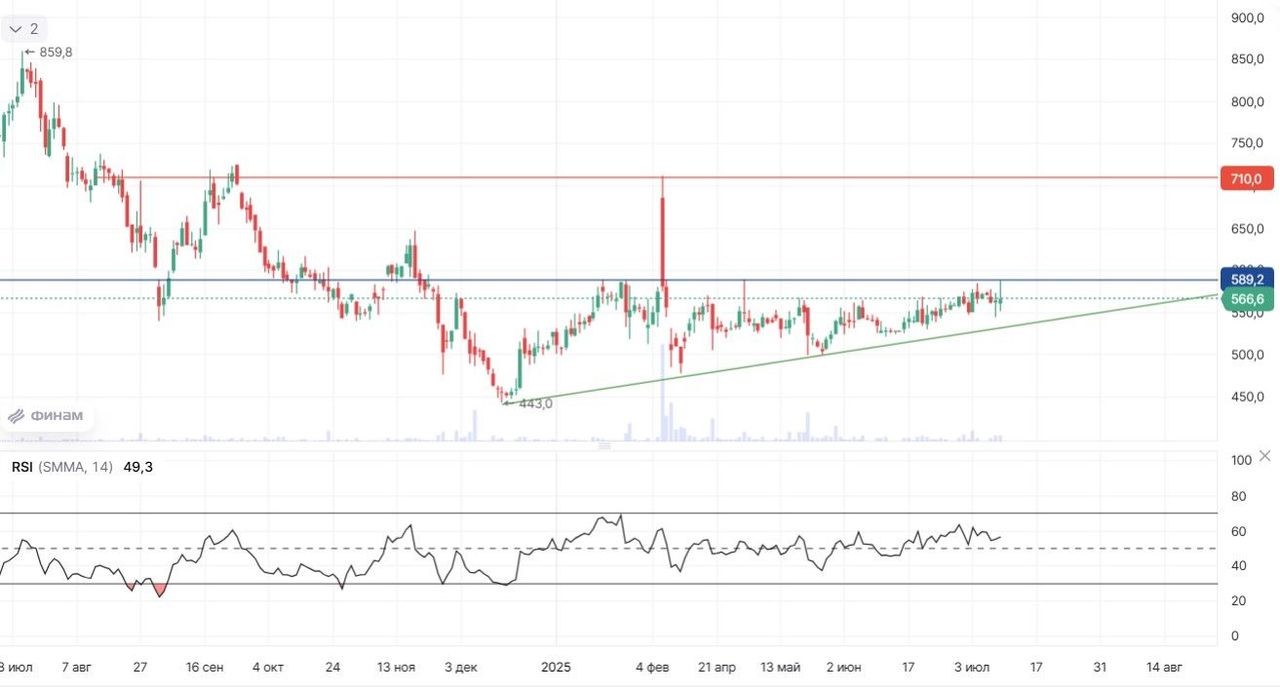На дневном графике котировки консолидируются на уровне 560 руб. и двигаются по локальному восходящему тренду. Главным уровнем сопротивления выступает 589 руб. Пробитие этого уровня может привести к росту акций, до 710 руб. за акцию.