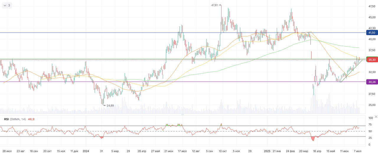 На дневном графике видно, что котировки Luxshare приблизились к ключевому уровню сопротивления в районе CNY 36, который в настоящее время совпадает со 100-дневной скользящей средней. В случае уверенного пробоя этого уровня следующей целью для роста могут стать отметки, расположенные вблизи уровней до апрельского падения — около CNY 42.