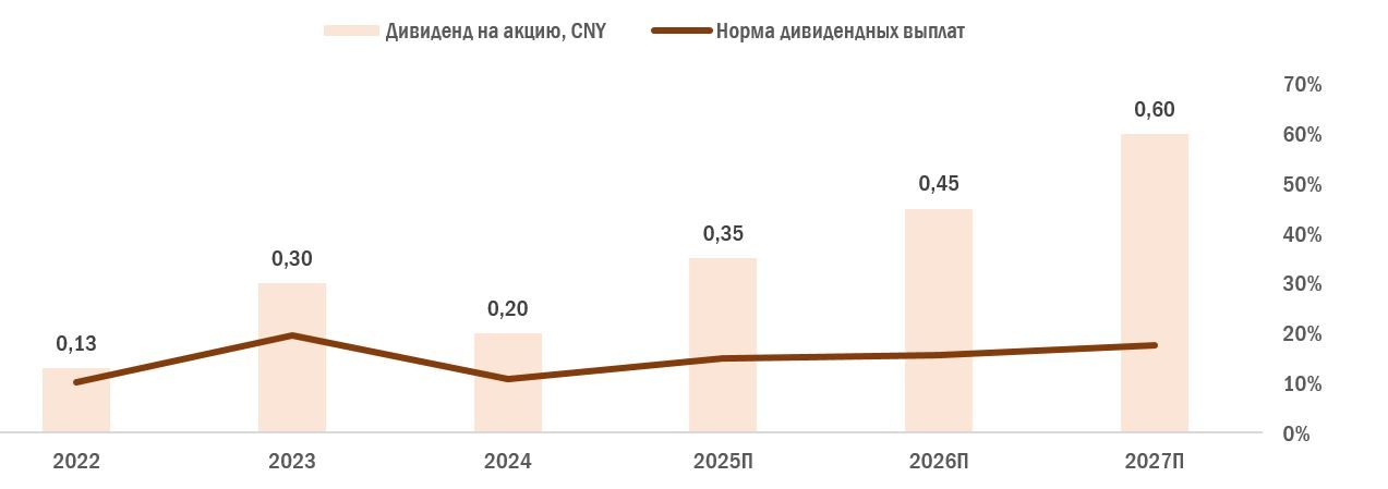 Стабильные, но невысокие дивиденды. В последние годы компания направляла порядка 10–20% чистой прибыли на выплату дивидендов. Мы ожидаем, что рост чистой прибыли в ближайшие годы даст менеджменту возможность увеличивать размер выплат. По нашим оценкам, в ближайшие 12 месяцев размер дивидендов может составить CNY 0,35 на акцию, что соответствует дивдоходности на уровне 1,0%.