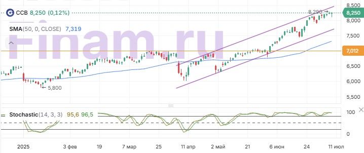 С точки зрения технического анализа на дневном графике акции CCB класса H движутся вблизи верхней границы восходящего канала. Бумаги выглядят локально перекупленными, ожидаем формирования коррекции к нижней границе фигуры, в район HKD 7,70.