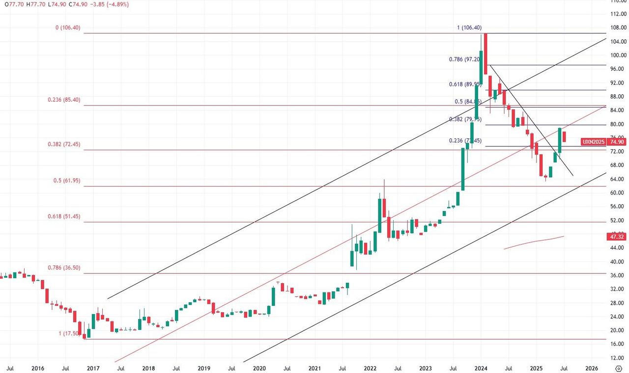 Вернёмся теперь к оценке ситуации на рынке урана с точки зрения анализа поведения цены на графике. В прошлый раз мы писали о том, что необходимо дождаться преодоления уровня $73,5/ф, что в дальнейшем и произошло. Таким образом, если мы обратимся к недельным графикам, то увидим, что цена закрыла один из своих гэпов вниз, который был сформирован в середине декабря 2024 г. Вместе с тем, уже в июне образовался достаточно большой гэп, но в этот раз наверх, а это повод для того, чтобы цена снизилась и закрыла его.