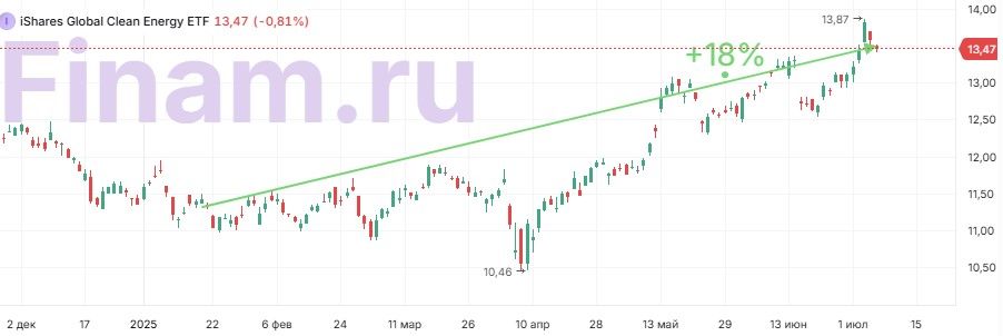 С момента публикации нашей идеи по iShares Global Clean Energy ETF от 17 января он вырос на 18%. Во многом рост был связан с низкой базой – сектор возобновляемой энергетики снижался после избрания Дональда Трампа, опасаясь ухода США в сторону углеводородов. В то же время данные опасения были отыграны инвесторами заранее, после чего последовал отскок на фоне низкой оценки по мультипликаторам входящих в ETF компаний и продолжающегося развития ВИЭ в США и в мире. На этом фоне мы сохраняем умеренно позитивный взгляд на iShares Global Clean Energy. Наша целевая цена по нему составляет $ 14,72, апсайд – 9%.