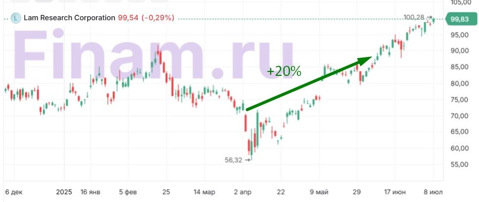 С момента открытия инвестиционной идеи на покупку акций Lam Research 2 апреля бумаги компании к 10 июня полностью отыграли падение, вызванное введением «зеркальных» пошлин, и достигли нашей целевой цены. Восстановлению котировок способствовал также сильный отчет за третий квартал 2025 финансового года: результаты Lam Research превзошли консенсус-прогнозы, а менеджмент озвучил уверенные ожидания на четвертый квартал. Основным драйвером роста в настоящее время выступает увеличение поставок оборудования для контрактных производителей чипов, которые наращивают мощности на фоне высокого спроса на ИИ-процессоры. Текущая стоимость акций Lam Research превышает наш целевой ориентир $87,6, и мы сохраняем осторожную позицию в отношении их дальнейшей динамики, учитывая сохраняющиеся риски обострения торговых противостояний.