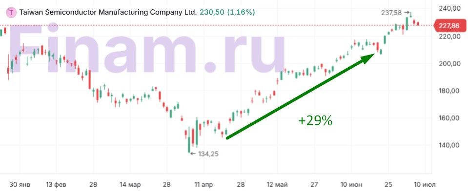 Мы рекомендовали покупку акций TSMC после их резкого падения на фоне введения американских «зеркальных» пошлин. Котировки ведущего контрактного производителя чипов быстро восстановились и всего за 30 дней достигли нашей целевой цены. TSMC продолжает публиковать сильные отчеты, демонстрируя рост выручки более чем на 40% за первые пять месяцев 2025 года благодаря устойчивому спросу на ИИ-чипы. Тем не менее текущий уровень цен на акции TSMC, на наш взгляд, является завышенным: 1 июля мы понизили рейтинг бумаг до «Продавать». Мы полагаем, что рынок недооценивает риски усиления торговых барьеров для мировой экономики, а также специфические для TSMC геополитические угрозы, связанные со статусом Тайваня.