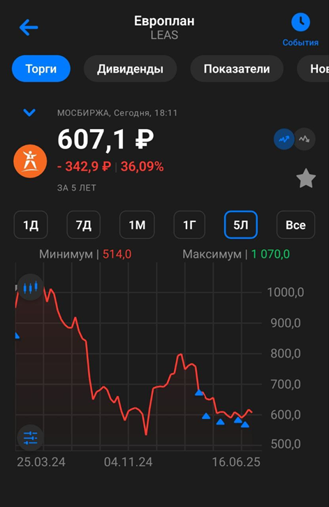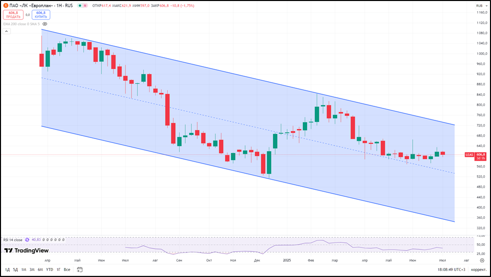IPO Европлана прошло по цене 875₽ в марте 2024 года. На данный момент цена на треть ниже. И вообще падение длится более года. С начала 2025 года снижение около 12%.